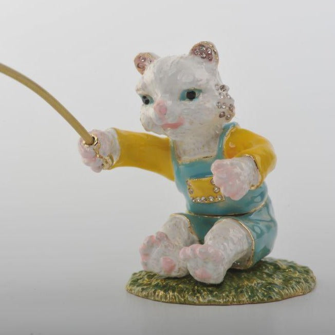 A delightful handmade Cat Fishing Gold Fish Faberge Styled Trinket Box .