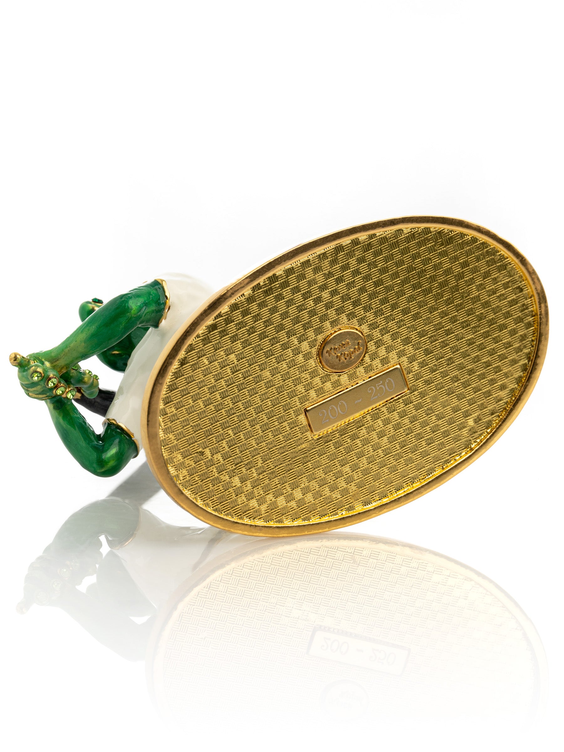 The frog trinket boxes embody the essence of art nouveau, a style that emerged in the late 19th century and celebrated organic forms, flowing lines, and a harmonious blend of nature and art. Keren Kopal's creations capture this aesthetic with their intricate enamel work, delicately painted details and the incorporation of Austrian and Swarovski crystals that mimic the iridescent quality of a frog's skin.
